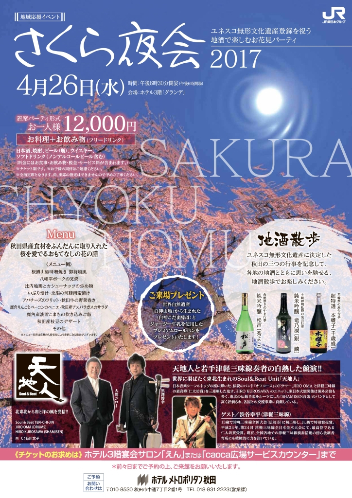 秋田の行事「角館祭りのやま行事」「土崎神明社祭の曳山行事」「花輪祭の屋台行事」がユネスコ無形文化遺産に登録されたことを祝い、お花見気分で楽しむ「さくら夜会」を開催いたします。 各地の地酒「秀よし」「銀鱗」「千歳盛」とともに、秋田県産食材をふんだんに取り入れた桜の季節にふさわしい花の膳でおもてなしいたします。 世界に羽ばたく東北生まれのSoul&Beat TEN-CHI-JIN(天地人)と若手津軽三味線奏者 渋谷幸平による、躍動感あふれるスペシャルライブ も開催!!