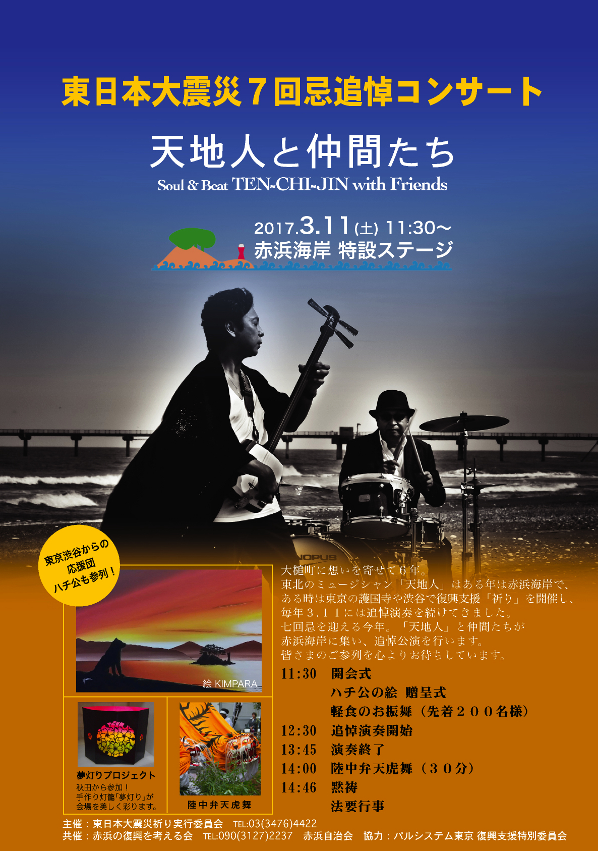 東日本大震災から6年、七回忌をむかえる今年。天地人と仲間たちが大槌町赤浜海岸にて追悼公演を行います。